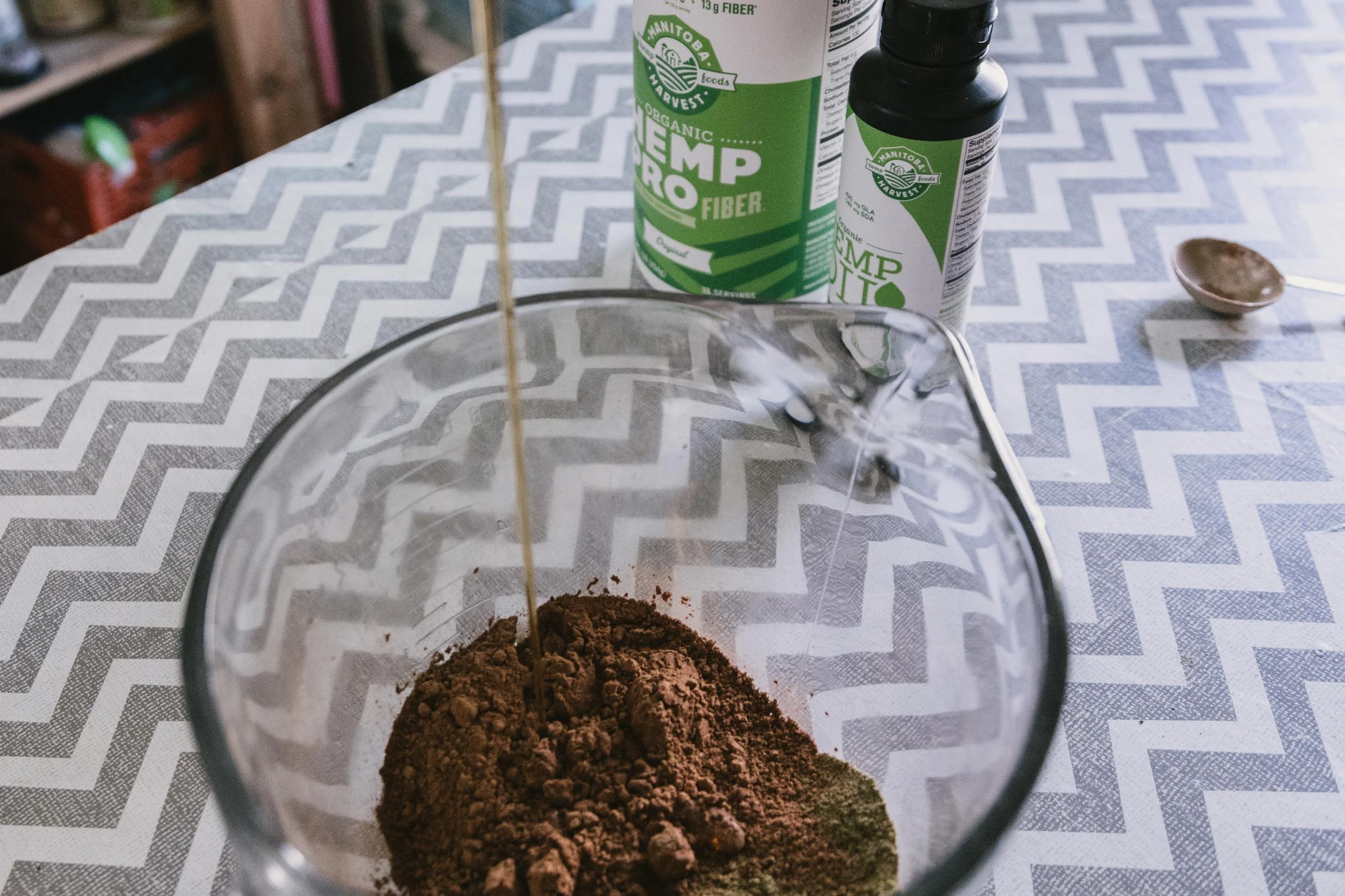 - Mix hemp powder, cocoa powder, coconut flour and baking powder.
