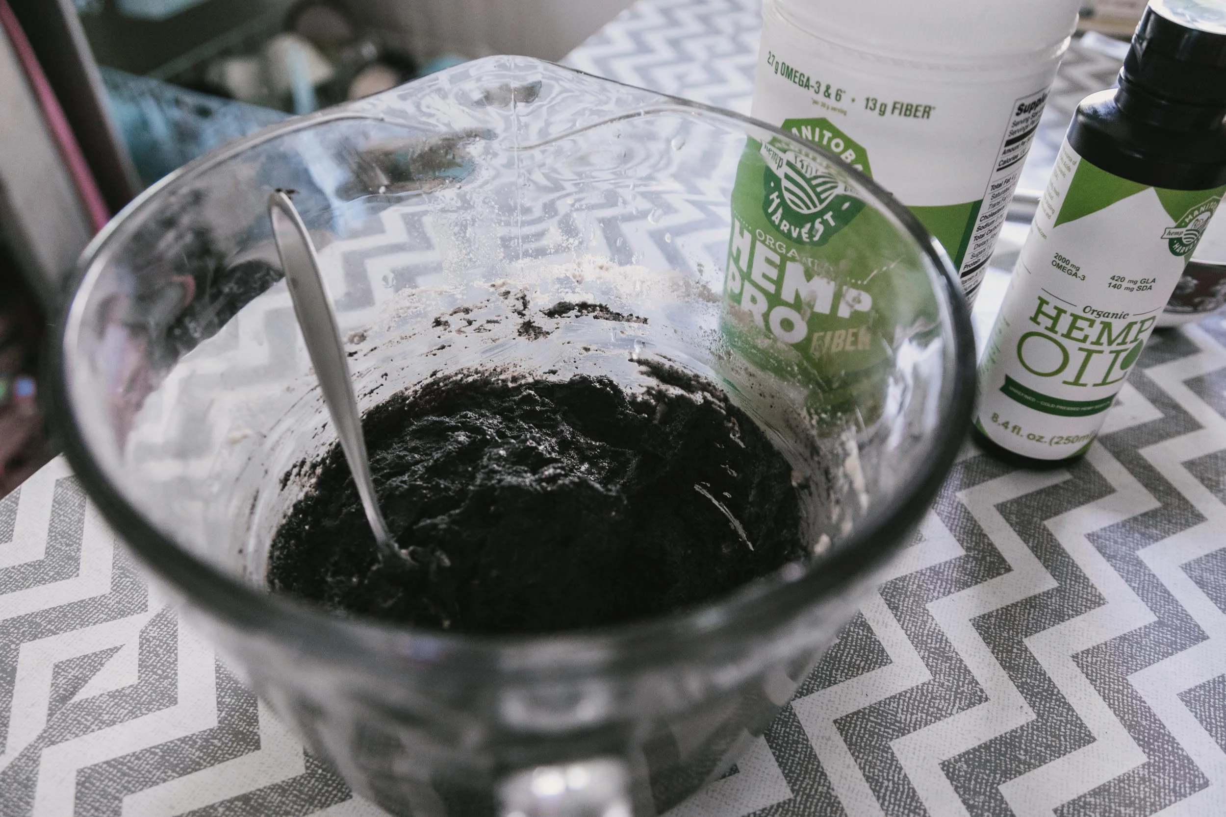 - Mix in hemp oil, maple syrup, vanilla and flax egg.
