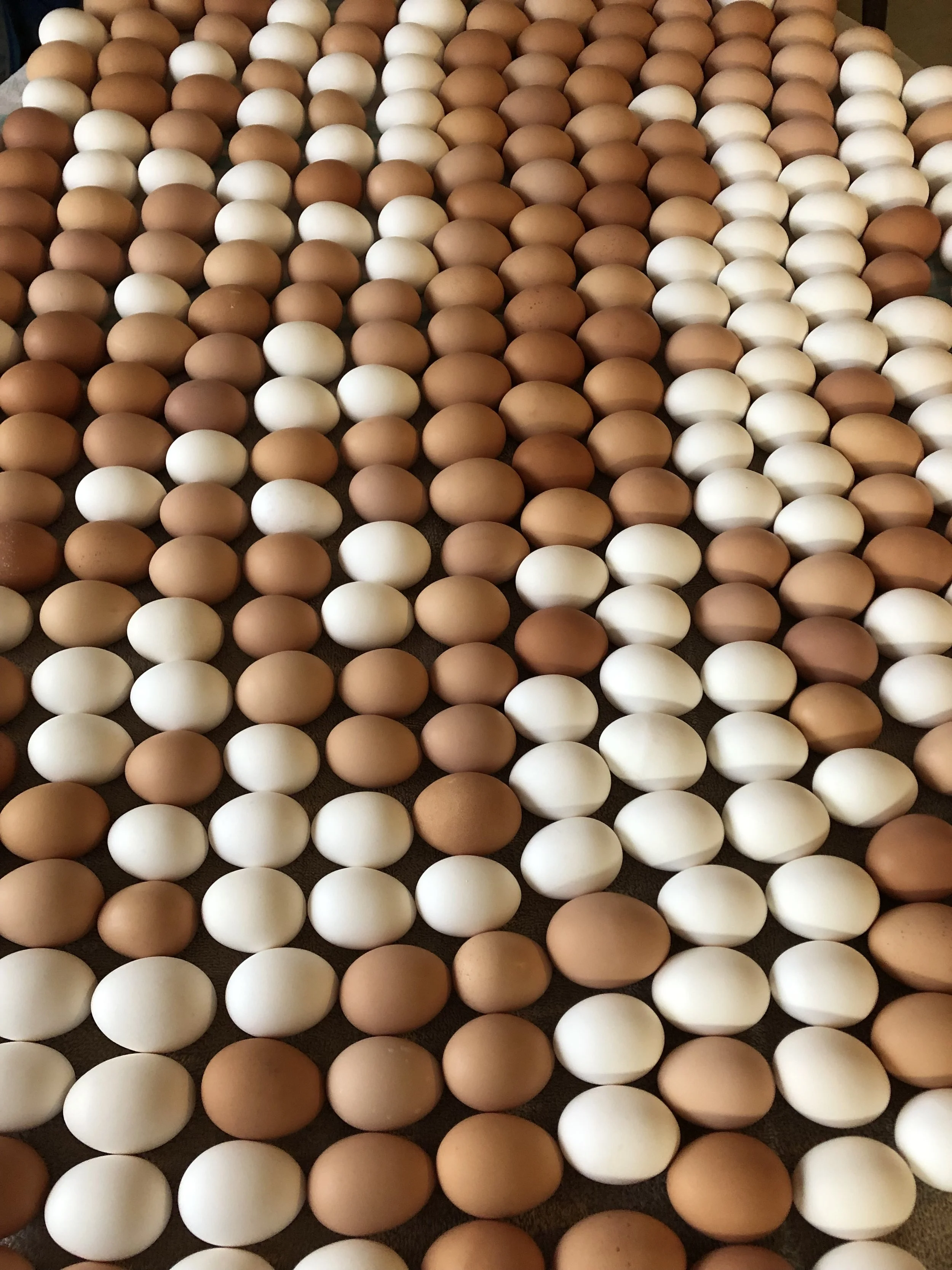 The color of the shell has no effect on the quality & nutritional factor of the eggs. It is the genes of the different breeds that determine egg shell color. The nutritional intake of the hens is what determines the taste, nutrition, & quality of the treasures hidden within. At H&H Farm, they let their hens out every, single day to forage plants, bugs, & rocks for at least 5 hours a day in the summer & 4 hours in the winter. This is to ensure happy hens & high quality eggs.